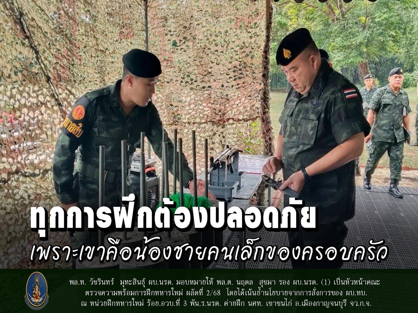 พลโท วัชรินทร์ มุทะสินธุ์ ผู้บัญชาการหน่วยบัญชาการรักษาดินแดน มอบหมายให้ พล.ต.นฤดล สุขมา รองผู้บัญชาการหน่วยบัญชาการรักษาดินแดน เป็นหัวหน้าคณะ ตรวจความพร้อมการฝึกทหารใหม่ ผลัดที่ 2/68 โดยได้เน้นย้ำนโยบายจากการสั่งการของผู้บัญชาการกองทัพบกให้ความสำคัญของการฝึกทหารใหม่ให้ผู้ฝึกปฏิบัติตามนโยบายและแนวทางที่กองทัพบกกำหนดอย่างเคร่งครัด กำกับดูแลในรายละเอียดทุกขั้นตอนเพื่อให้การฝึกเป็นไปอย่างปลอดภัยและมีมาตรฐาน รวมถึงระวังไม่ให้เกิดการเจ็บป่วยจากโรคลมร้อน หรือเกิดอุบัติเหตุจากการฝึก ดูแลสภาพจิตใจทหารใหม่ให้มีขวัญกำลังใจที่ดี ทหารใหม่เสมือนเป็นน้องชายคนเล็กของครอบครัว และเน้นย้ำให้ครูฝึกให้ความรู้ทหารใหม่เกี่ยวกับกฎหมายป้องกันและปราบปรามการทรมานฯ ด้วย และให้ข้อแนะนำเรื่องการเสนอขออุปกรณ์การฝึกเพิ่มเติมของหน่วยฝึกให้ทันยุคทันสมัยและเกิดความพร้อม