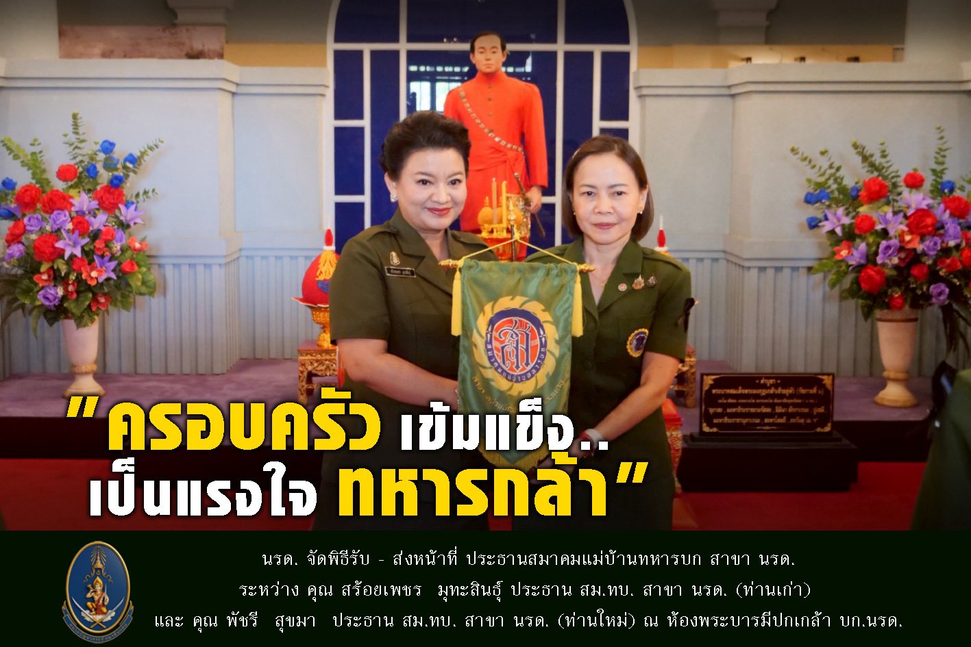 หน่วยบัญชาการรักษาดินแดน จัดพิธีรับ - ส่ง หน้าที่ ประธานสมาคมแม่บ้าน สาขาหน่วยบัญชาการรักษาดินแดน ระหว่าง คุณ สร้อยเพชร มุทะสินธุ์ ประธานสมาคมแม่บ้าน (ท่านเก่า) และ คุณ พัชรี สุขมา ประธานสมาคมแม่บ้าน (ท่านใหม่) ณ ห้องพระบารมีปกเกล้า หน่วยบัญชาการรักษาดินแดน ภายหลังพิธีได้จัดให้มีการประชุมคณะกรรมการ สมาคมแม่บ้าน สาขาหน่วยบัญชาการรักษาดินแดน ครั้งที่ 1/69 โดยมี คุณ พัชรี สุขมา เป็นประธานการประชุมฯ ณ ห้องประชุมเกียรติศักดิ์เสือป่า หน่วยบัญชาการรักษาดินแดน