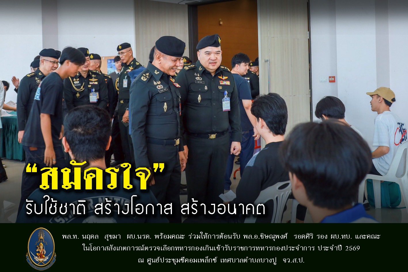 พลโท นฤดล สุขมา ผู้บัญชาการหน่วยบัญชาการรักษาดินแดน กรุณามอบหมายให้ พลตรี วินัย ลำโครัตน์ รองผู้บัญชาการหน่วยบัญชาการรักษาดินแดน เดินทางสังเกตการณ์ตรวจเลือกทหารกองเกินเข้ารับราชการทหารกองประจำการ ประจำปี 2569 ในการนี้ได้กรุณาเน้นย้ำการจัดบอร์ดประชาสัมพันธ์ชี้แจงสิทธิประโยชน์ของทหารกองประจำการเมื่อเข้ารับราชการกองประจำการเพื่อให้ประชาชน และทหารกองเกินได้รับทราบสิทธิต่าง ๆ และตัดสินใจร้องขอเข้ารับราชการทหารกองประจำการ ณ ห้องพระราม 2 ฮอลล์ ศูนย์การค้าเซ็นทรัล พระราม 2 แขวงแสมดำ เขตบางบอน กรุงเทพฯ